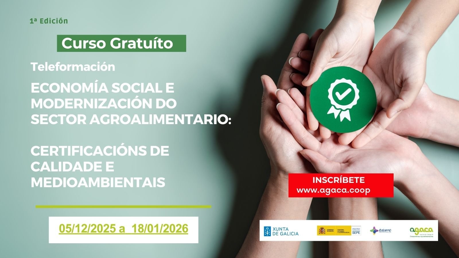 • El 5 de diciembre de 2025 comienza el curso gratuito “La economía social y la modernización del sector agroalimentario: certificaciones de calidad y medioambientales”, que se puede seguir online. Concluye el 18 de enero de 2026.
