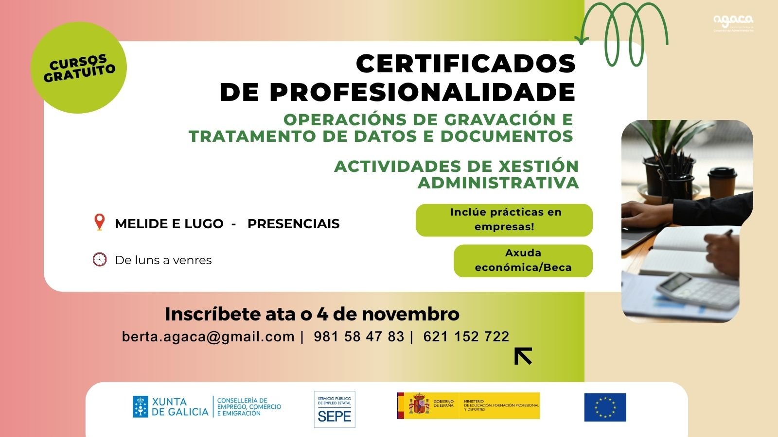 La Asociación Galega de Cooperativas Agroalimentarias (AGACA) abre el plazo de inscripción para los nuevos cursos gratuitos presenciales que comezarán el 17 de noviembre en Lugo y Melide. Se trata de formaciones oficiales reconocidas que preparan a las personas participantes para trabajar en distintos ámbitos de la administración, tanto en empresas como en entidades públicas.