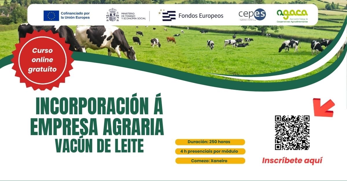 La Asociación Gallega de Cooperativas Agroalimentarias (AGACA) pone en marcha un nuevo curso online de ‘Incorporación a la empresa agraria. Vacuno de leche’, que comenzará en los últimos días del mes de enero y se desarrollará en la plataforma de teleformación de AGACA. de