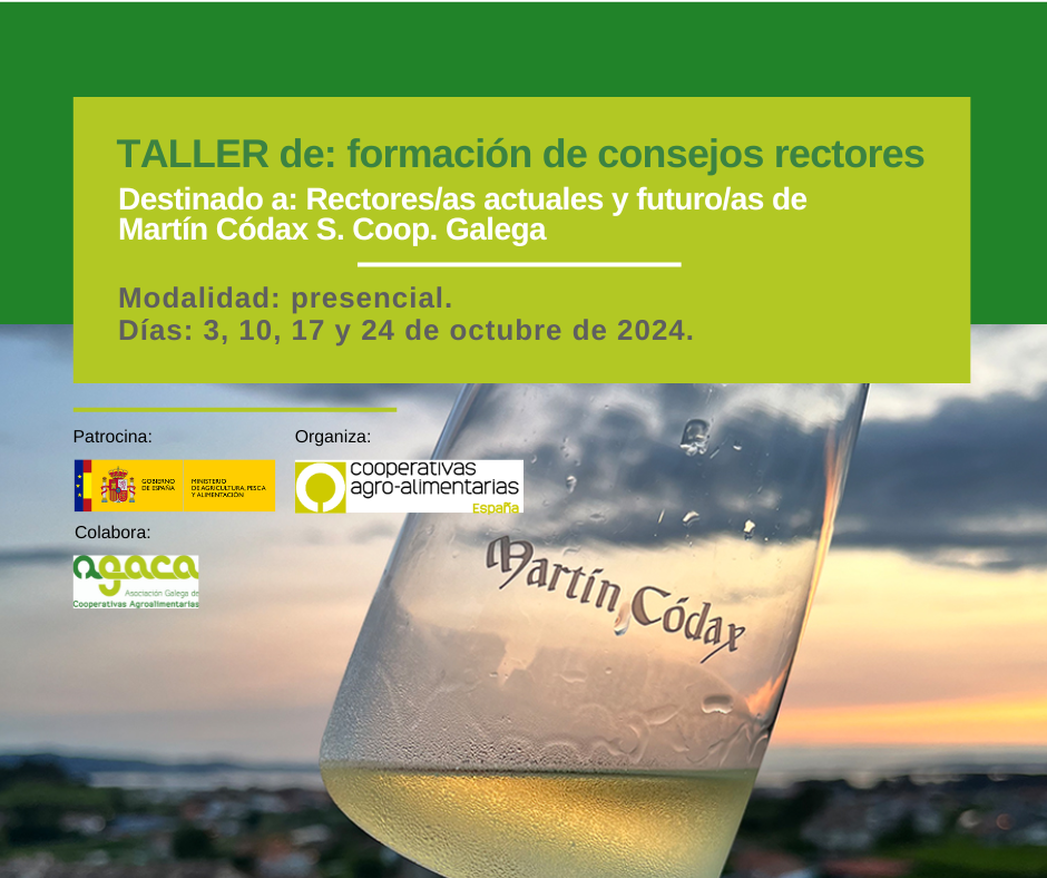 Técnicos de AGACA impartirán un obradoiro dirixido a membros do actual consello reitor da cooperativa Martín Códax, a persoas interesadas en desempeñar un cargo nel no futuro e a persoas mozas e mulleres socias da entidade vitivinícola.
