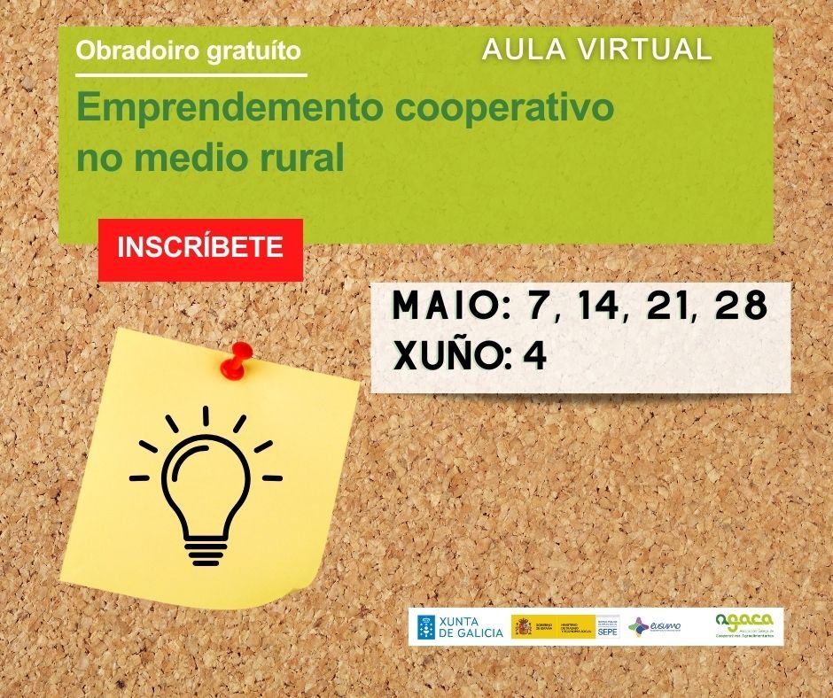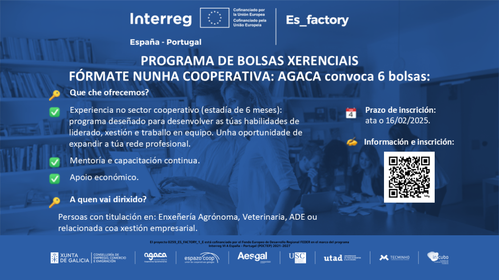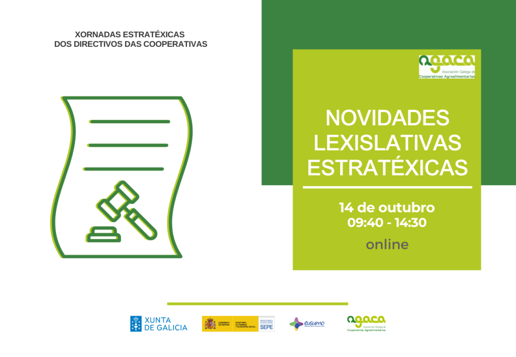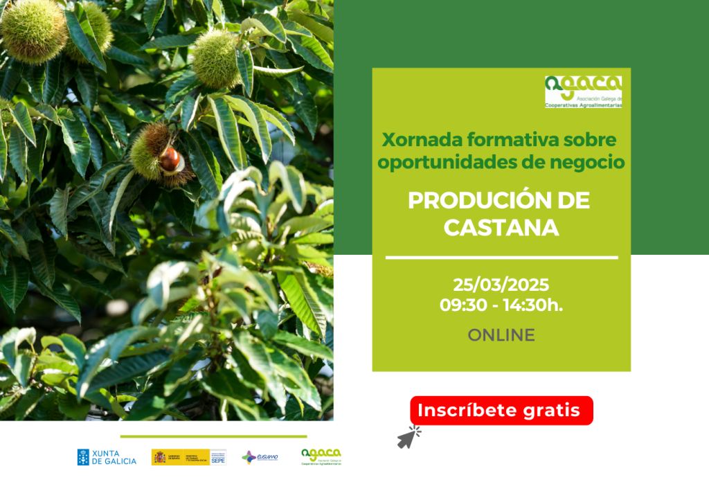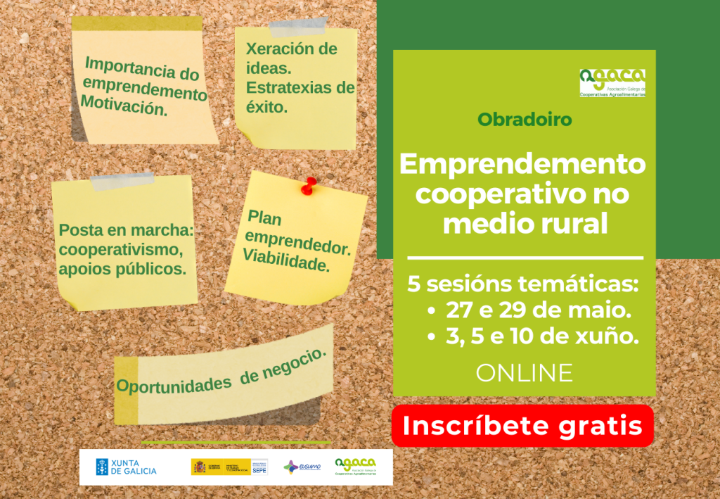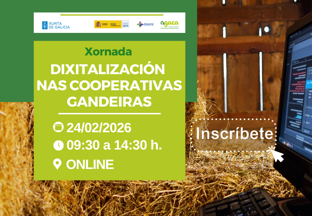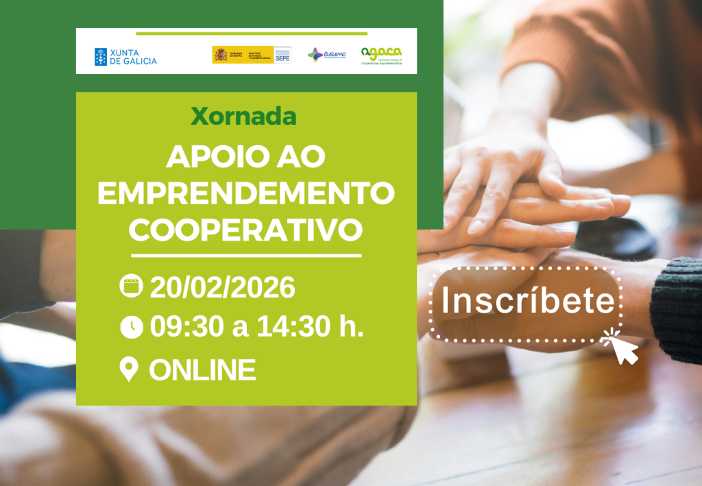 A xornada “Apoio ao Emprendemento Cooperativo” terá lugar o 20 de febreiro de 2026, de 09:30 a 14:30 h en liña. É gratuíta e a inscrición realízase cubrindo este formulario. AGACA imparte a xornada “Apoio ao Emprendemento Cooperativo” co obxectivo de favorecer que as cooperativas agroalimentarias manteñan uns idóneos equilibrios e niveis de estrutura financeira, […]