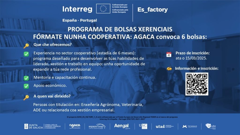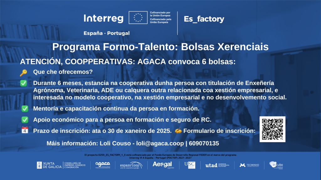 No marco do proxecto europeo Interreg POCTEP ES-Factory, AGACA pon en marcha o programa Espazos Efímeros de Emprendemento, unha iniciativa dirixida a apoiar ás cooperativas e ás empresas mercantís da súa propiedade maioritaria na promoción, innovación e modernización das súas estratexias comerciais. Os Espazos Efímeros desenvolveranse na Praza de Abastos de Santiago de Compostela, o […]