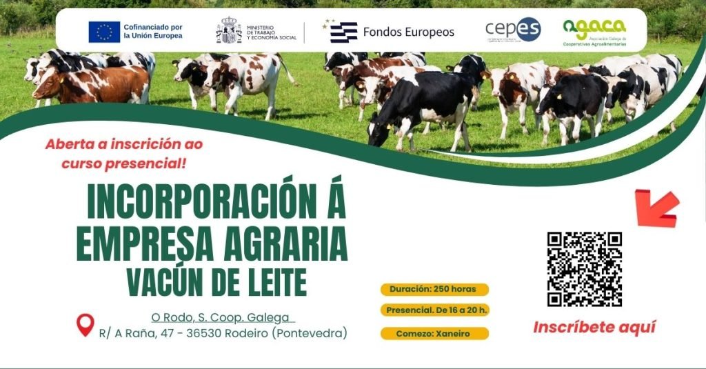 A Asociación Galega de Cooperativas Agroalimentarias (AGACA) pon en marcha un novo curso presencial de Incorporación á empresa agraria. Vacún de leite, que comezará no mes de xaneiro e se desenvolverá nas instalacións de O Rodo, S. Coop. Galega, en Rodeiro (Pontevedra). A inscrición ao curso xa está aberta e pode realizarse a través do […]