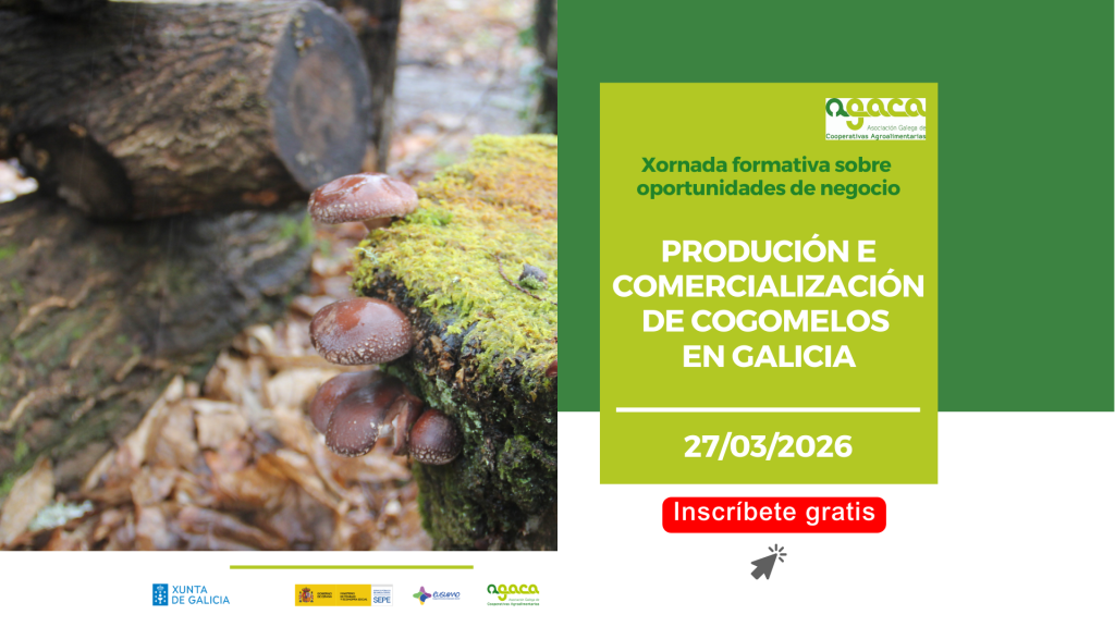 O 27de marzo terá lugar a quinta sesión do ciclo 2026 de Xornadas formativas sobre oportunidades de negocio, dedicada á produción e comercialización de cogomelos. A inscrición é gratuíta. Para inscribirse é necesario completar este formulario. O 27 de marzo de 2026 terá lugar a xornada ‘Produción e comercialización de cogomelos en Galicia’, de 09:30 […]