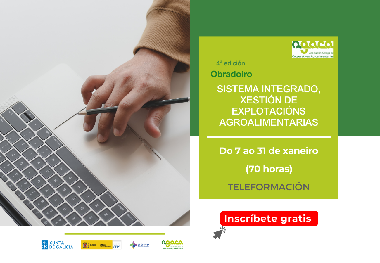 • A cuarta edición do obradoiro “Sistema integrado, xestión de explotacións agroalimentarias” terá lugar entre o 7 e o 31 de xaneiro de 2025, en modalidade de teleformación.