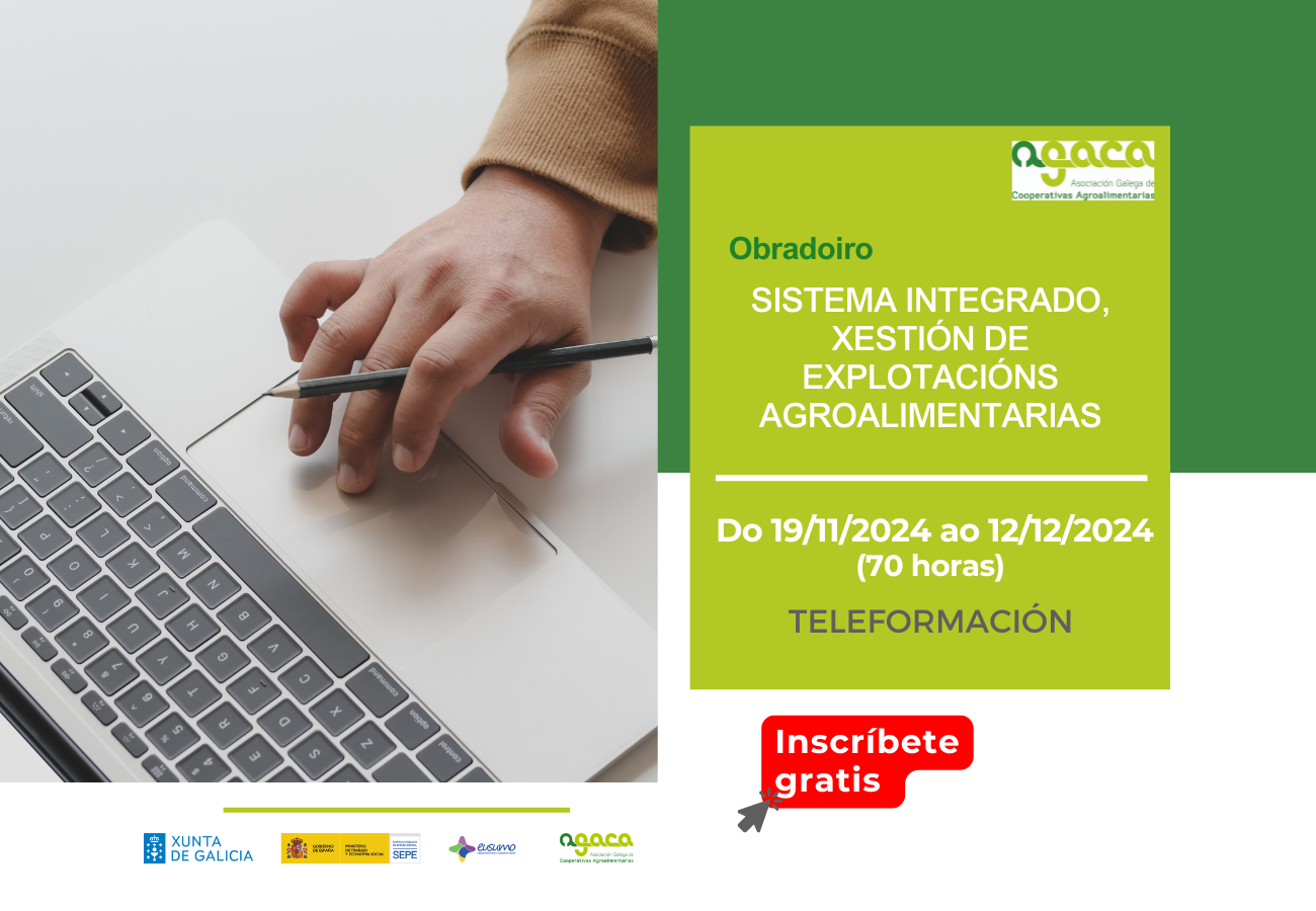 - A segunda edición do obradoiro “Sistema integrado, xestión de explotaciones agroalimentarias” desenvolverase entre o 19 de novembro e o 12 de decembro de 2024, en modalidade de teleformación.