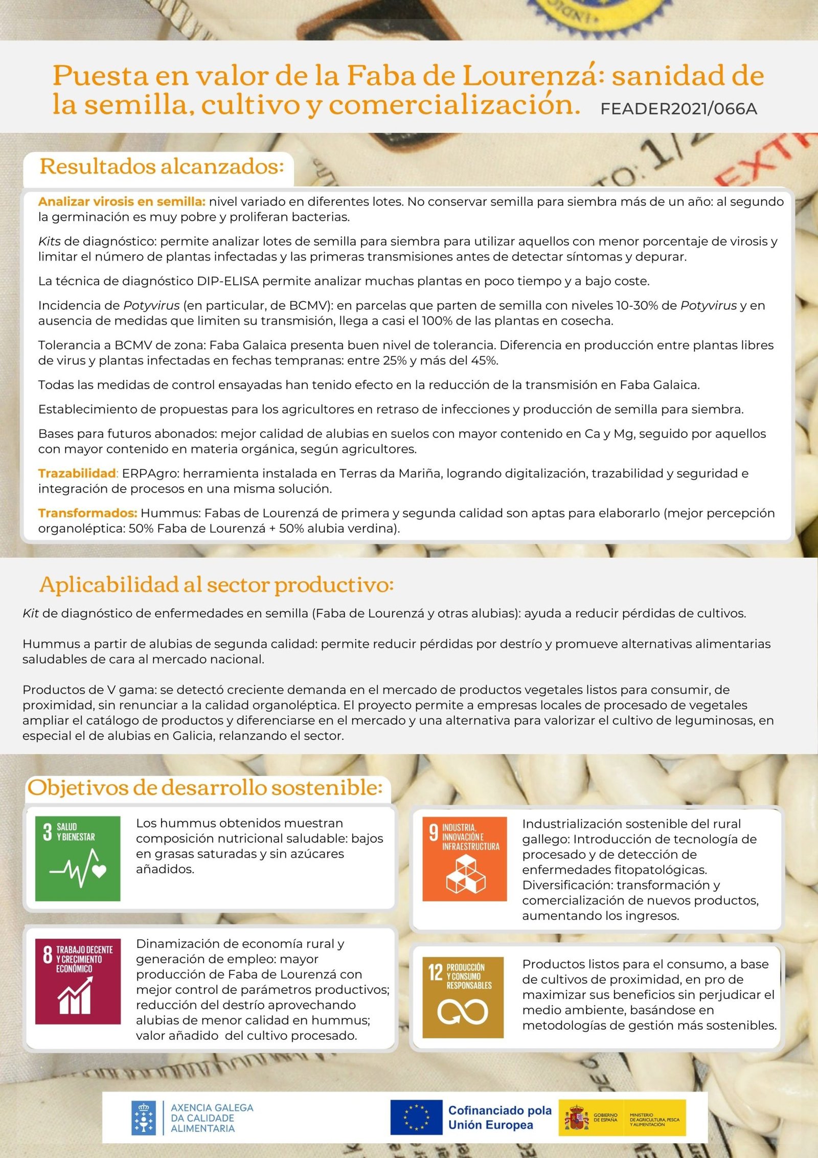Objetivo:El objetivo principal del proyecto es profesionalizar el cultivo de huerta de la Faba de Lourenzá, mejorando su producción sin mermar la calidad y aportando valor en su procesado y posterior comercialización. El proyecto engloba varios ámbitos, empezando por la evaluación de la sanidad de los lotes de semilla y el seguimiento epidemiológico para encontrar las mejores técnicas de cultivo, de protección y de selección de la semilla. Para eso, trabaja en la creación de un kit de análisis de potyvirus y Ps. Ph. que ayude a mejorar la sanidad de las plantas, disminuyendo la incidencia de virosis y la pérdida de producción que ocasionan.