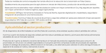 Busca, además, homogeneizar la calidad de la faba y crear un programa de trazabilidad y gestión integral de este producto, con datos desde su origen a hasta la trayectoria de los lotes. En cuanto a la comercialización, aspira a revalorizar la Faba de Lourenzá con nuevos productos como el hummus de faba, que aporten valor añadido manteniendo una producción sostenible y respetuosa con el medio y la tradición.